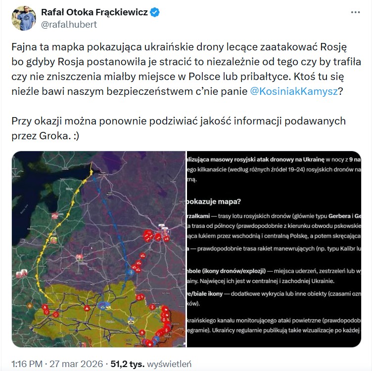 Przekaz szybko przedostał się do polskiego segmentu platformy X. Dwa najbardziej widoczne przykłady zadały ton całej kampanii. 27 marca publicysta Rafał Otoka Frąckiewicz (@rafalhubert) opublikował materiał z ową rosyjską „mapką” i komentarz: