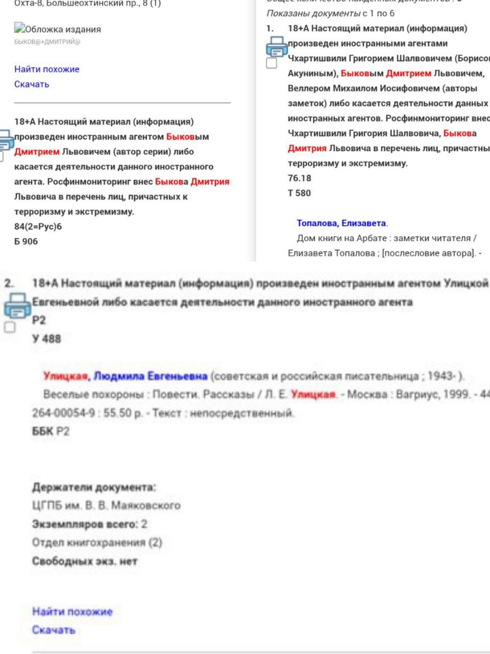Uwaga „Wschodów”: Z „nieprzyjaznych” krajów, takich jak Polska, gdzie znajduje się redakcja, strona biblioteki Majakowskiego nie jest dostępna. Jednak czytelnicy z Rosji potwierdzili: podczas prób wyszukania dzieł pisarzy-„zagranicznych agentów” Ulickiej, Akunina, Bykowa na stronie pojawiają się odpowiednie oznaczenia z ograniczeniem wiekowym 18+. W przypadku Akunina i Bykowa dodaje się jeszcze, że obaj zostali wpisani przez Rosfinmonitoring na „listę osób związanych z terroryzmem i ekstremizmem”. Jednocześnie treść utworu wydaje się nie mieć żadnego znaczenia. Ostrzeżenia te wyglądają na stronie biblioteki następująco („Wschody” zebrały kolaż z kilku przesłanych zrzutów ekranu):